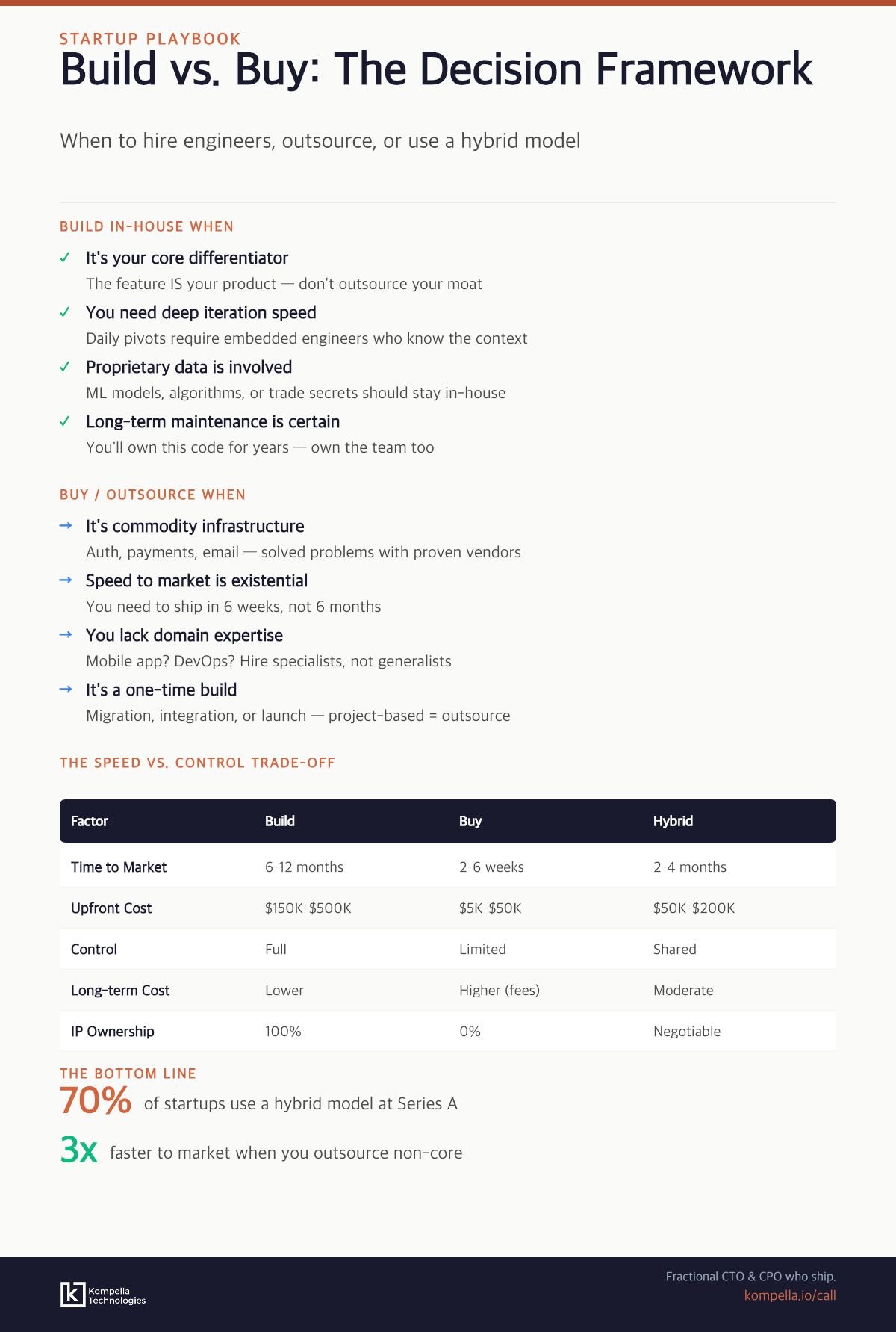 Build vs. buy isn't binary. Here's a framework for deciding when to hire engineers, outsource, or use a hybrid model.
