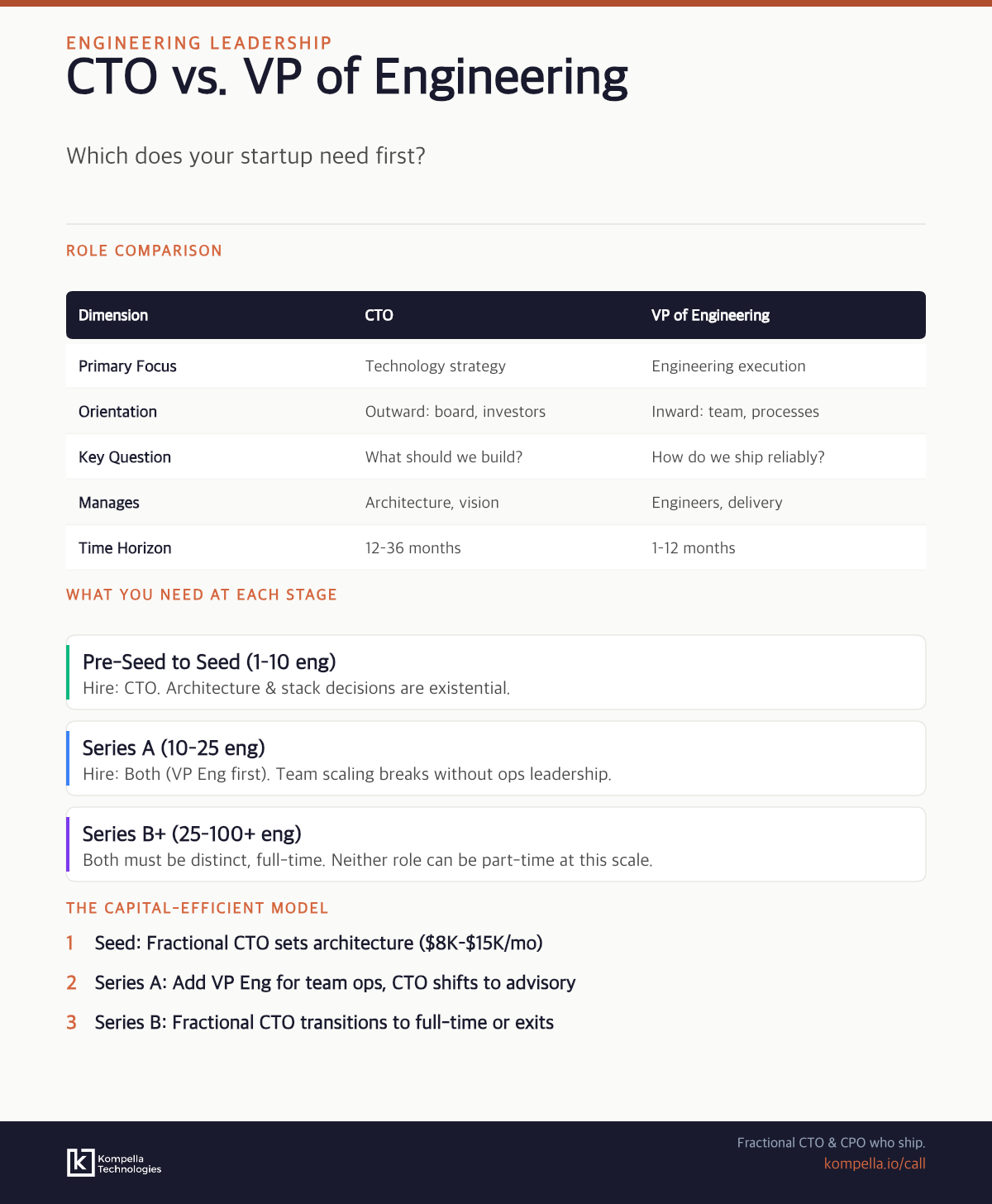 Getting this wrong is expensive. Hire a VP of Engineering when you need a CTO, and you'll have a well-run team building the wrong product. Hire a CTO when you need a VP of Engineering, and you'll have brilliant architecture with no one to execute it.