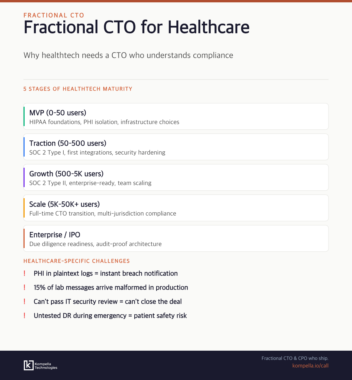 Your engineers are talented. Your product vision is strong. But healthcare technology isn't just software — it's software where a compliance mistake can end your company, an architecture decision can lock you out of enterprise contracts, and a security gap can put patient data on the front page.